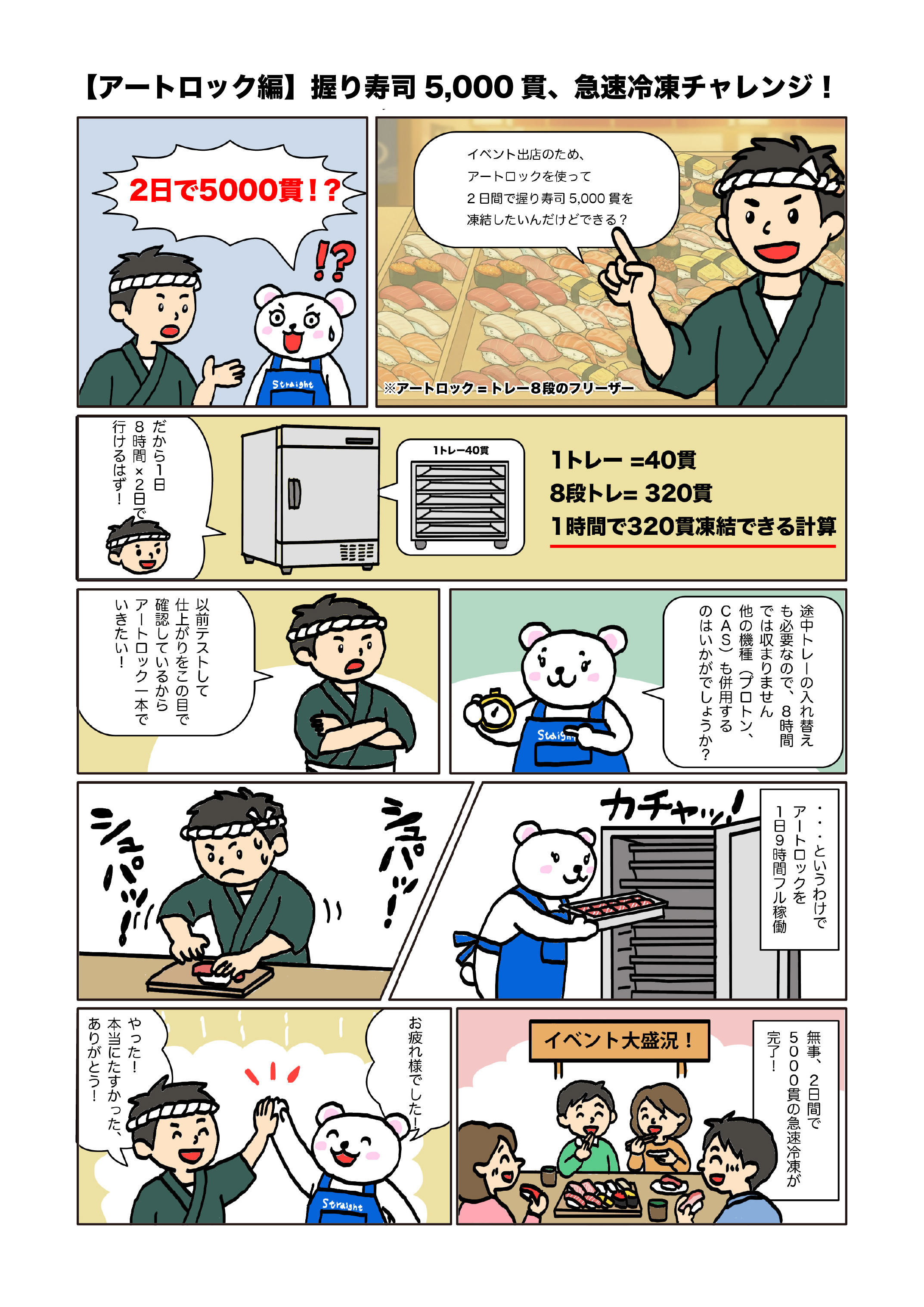 白くまストックなら各メーカーのデモンストレーションに地域&日時をまたいで視察に行くこと無く最短1日(2時間)でアートロック・CAS・プロトン・凍眠の4大メーカー急速冷凍機を、お客様ご自身の目で納得がいくまで自由にお試しいただけます。